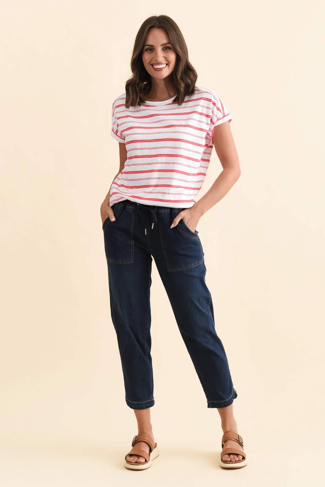 - Straight silhouette with stylish taupe contrast stitching