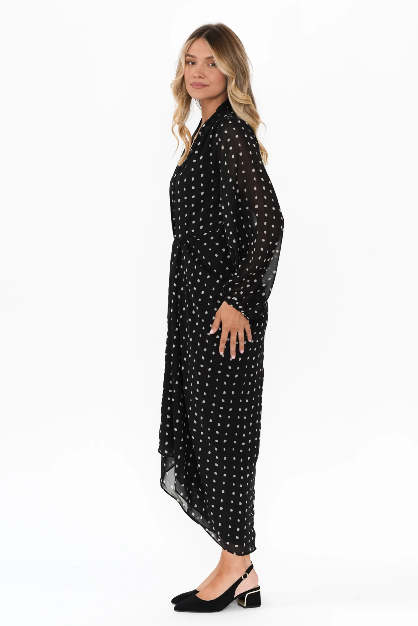- Cascading skirt with a subtle Hi-Lo hemline falls to midi-length